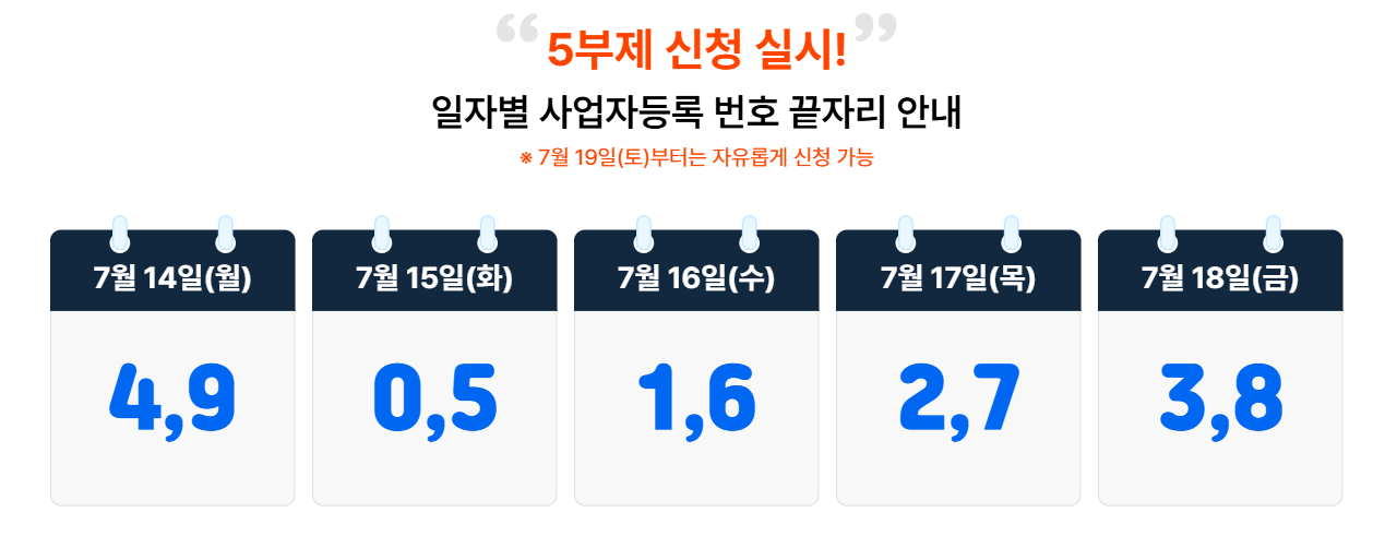 - 7월 14일~18일: 사업자등록번호 끝자리 5부제 운영