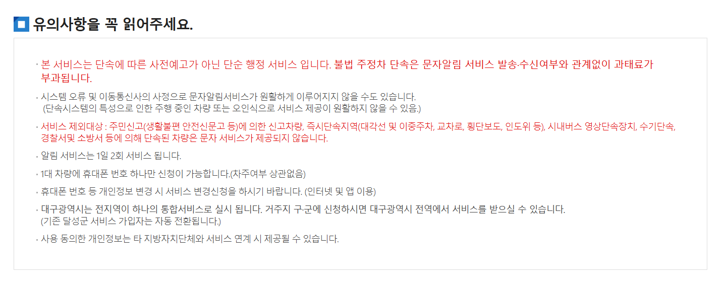 다음은 대구광역시 주정차단속 알림서비스 안내사항입니다. 서비스 제외대상과 대구광역시는 1대 차량에 차주여부 상관없이 휴대폰 번호 하나만 신청이 가능하다고 합니다.