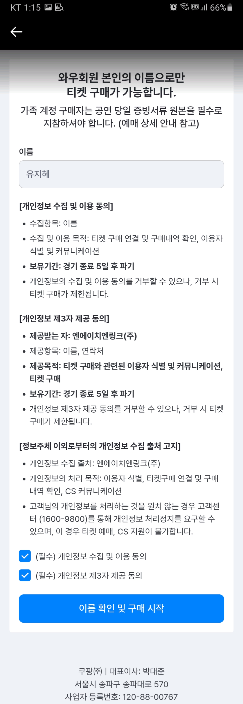 | 1. 경기 당일 티켓을 예매 및 소유한 와우회원 본인이 입장하셔야 하며, 동행인은 예매자인 와우회원과 함께 입장하셔야 합니다. 2. 단, 직계존비속, 배우자, 형제자매 명의의 쿠팡 ID를 사용하여 예매한 고객의 경우, 예매자가 실관람자의 직계존비속, 배우자, 형제자매임을 증명한 경우에 한해 경기장 입장을 허용합니다. 해당 경우 아래 증빙들을 반드시 모두 지참해주세요. 1) 가족관계증명서 또는 주민등록등본 중 1부 (모두 원본만 인정) 2) 예매자 신분증 3) 실관람자 신분증 *2), 3)의 신분증은 하단의 [유효 신분증]만 인정됩니다. 반드시 사전에 확인 부탁드립니다. |